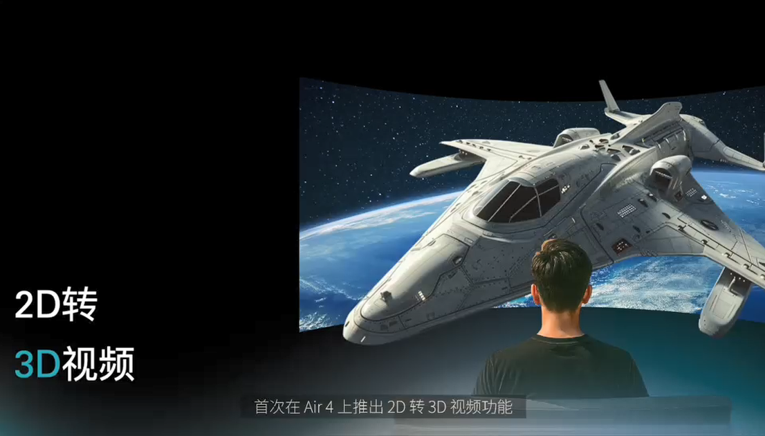 更进一步的是AI的引入。Air 4系列支持的AI HDR和AI 3D功能,让设备拥有了“感知与适应”的能力。像AI 3D功能可以将普通的2D视频,通过AI算法实时转化为具有景深效果的3D影像;而3D SBS功能,则能通过两块屏幕形成的视觉差,让用户可以实时感受无边界的立体视觉。